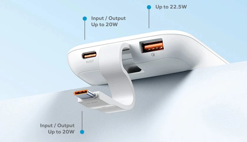 Tidak hanya include kabel, pada power bank ini juga terdapat port USB-C serta USB-A yang berfungsi untuk mengisi daya tiga device sekaligus.