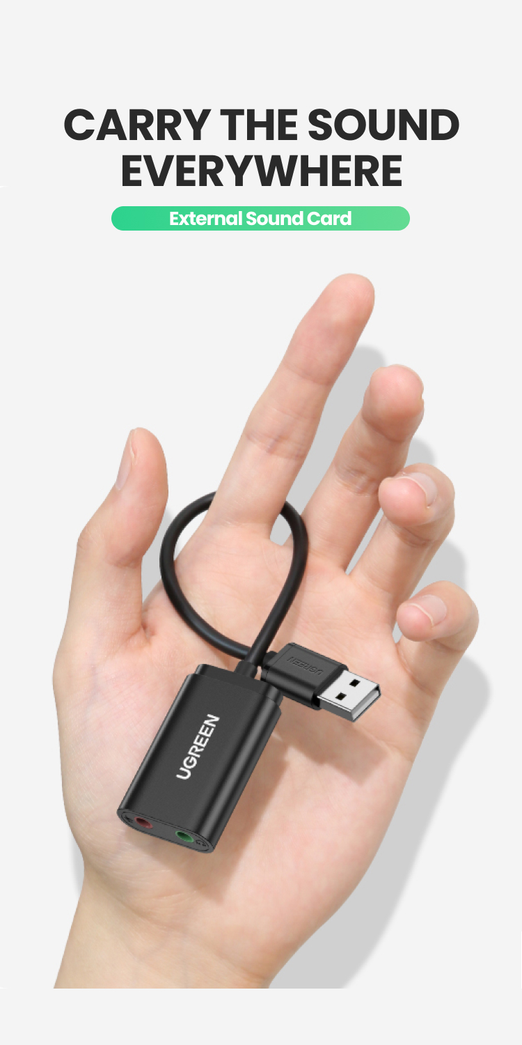 UGREEN USB External Sound Adapter US205 / CM129 berfungsi untuk menghubungkan laptop atau PC anda ke sebagian peralatan audio seperti soundbox, speaker, earphone hingga headphone.