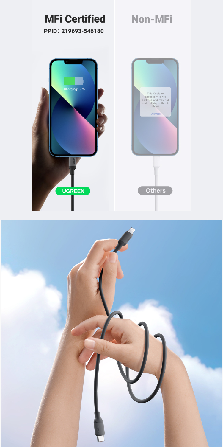 USB Type C to Lightning Ugreen US387 PD 20W MFi Silicone Cable Merupakan kabel dari Ugreen yang sudah MFi Certificate sehingga aman untuk digunakan pada Apple device. Kabel ini terbuat dari bahan silikon rubber yang lembut dan nyaman dipegang.