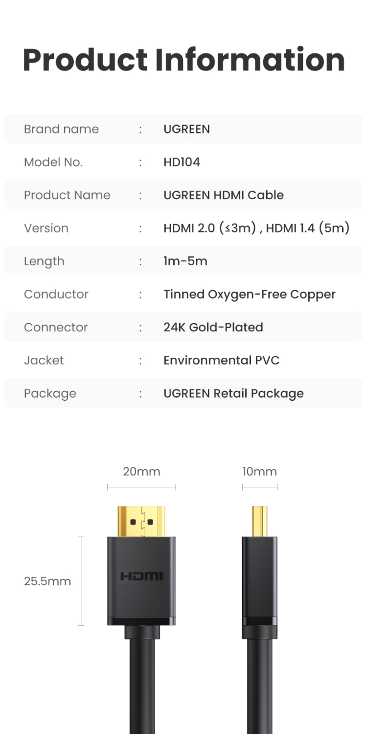 Kabel HDMi to HDMi Ugreen HD104 4k 60Hz Cable Merupakan kabel dari Ugreen yang sudah support 3D technology input / output untuk video 3D, Gaming 3D dan 3D Home Theater.
