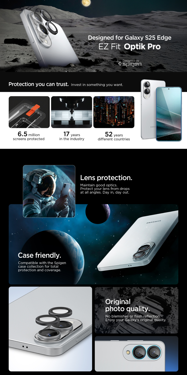 Camera Lens Tempered Glass Samsung Galaxy S25 Edge Series Spigen Pelindung Kamera Protector adalah pelindung kamera tempered glass yang dirancang khusus untuk melindungi modul kamera tanpa mengurangi kualitas foto. Dengan pemasangan yang mudah dan presisi, Camera Protector ini memberikan perlindungan ekstra, tapi tetap menjaga hasil foto tetap jernih dan tajam!
