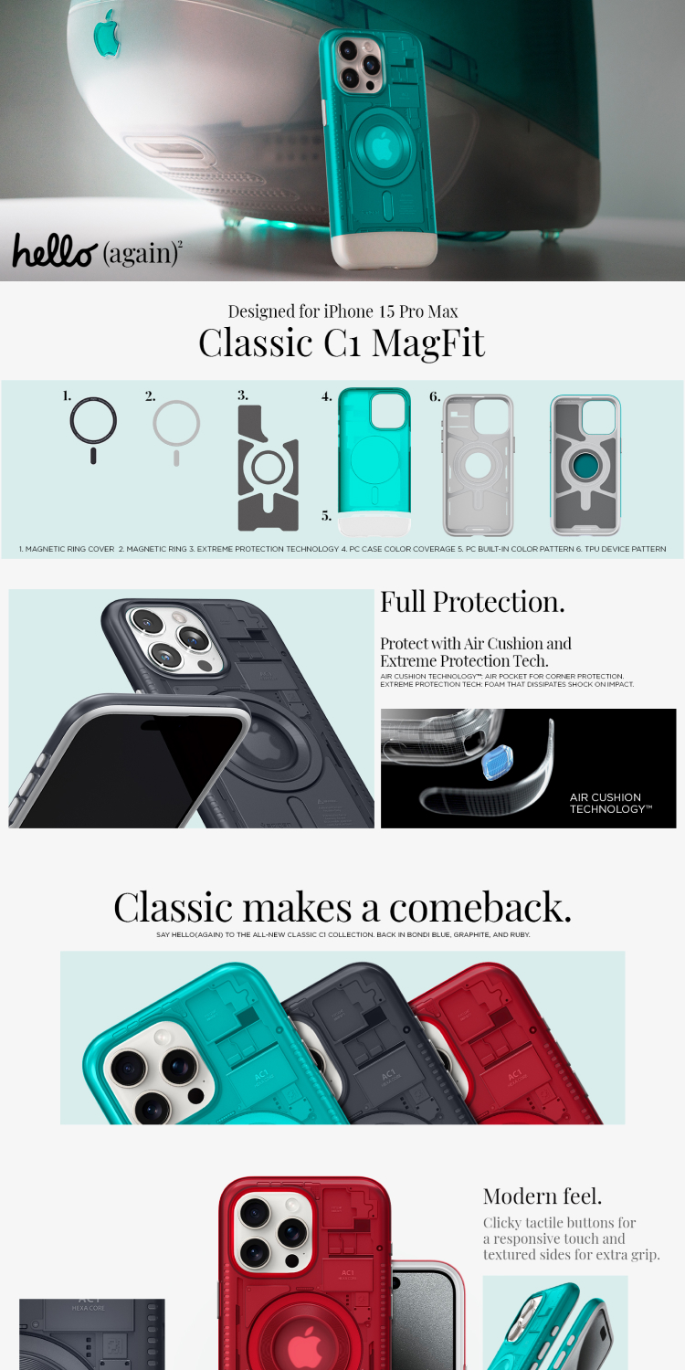Case iPhone 15 Pro Max Plus Spigen Classic C1 Magnetic Full Protection Casing merupakan casing dengan bahan Hybrid Casing dengan TPU (Softcase) pada casing bagian dalam dan PC (Hard casing) pada bagian luar yang kokoh dan kuat dengan desain klasik.