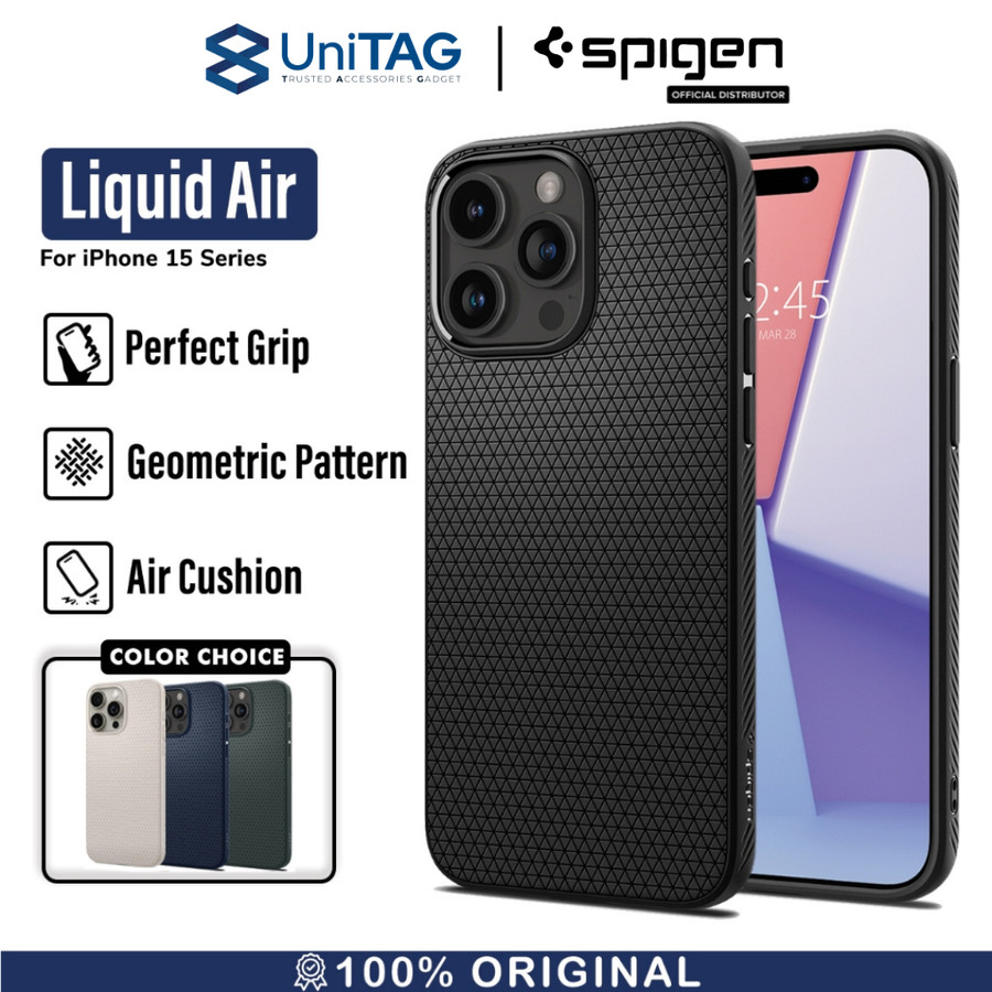 Case iPhone 15 Series Spigen Liquid Air merupakan full TPU Casing (Softcase) premium yang fleksibel dan tahan lama. Spigen Liquid Air dibekali dengan Air Cushion Technology untuk meredam benturan.