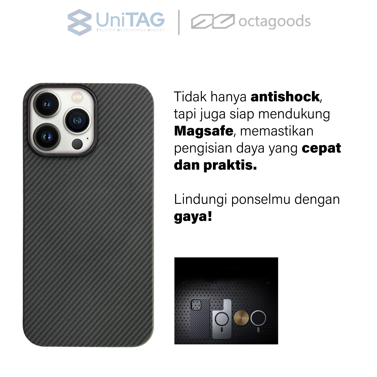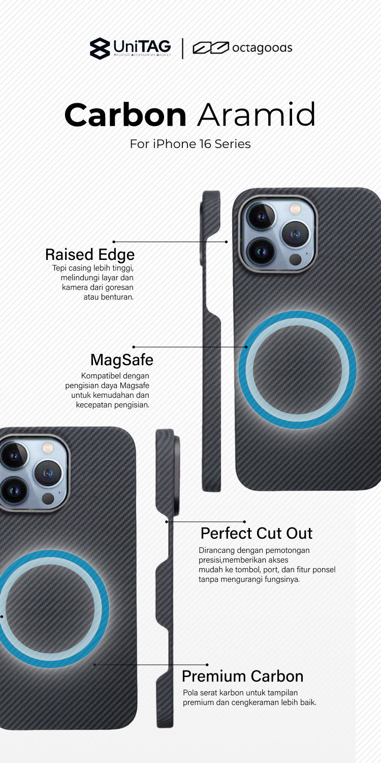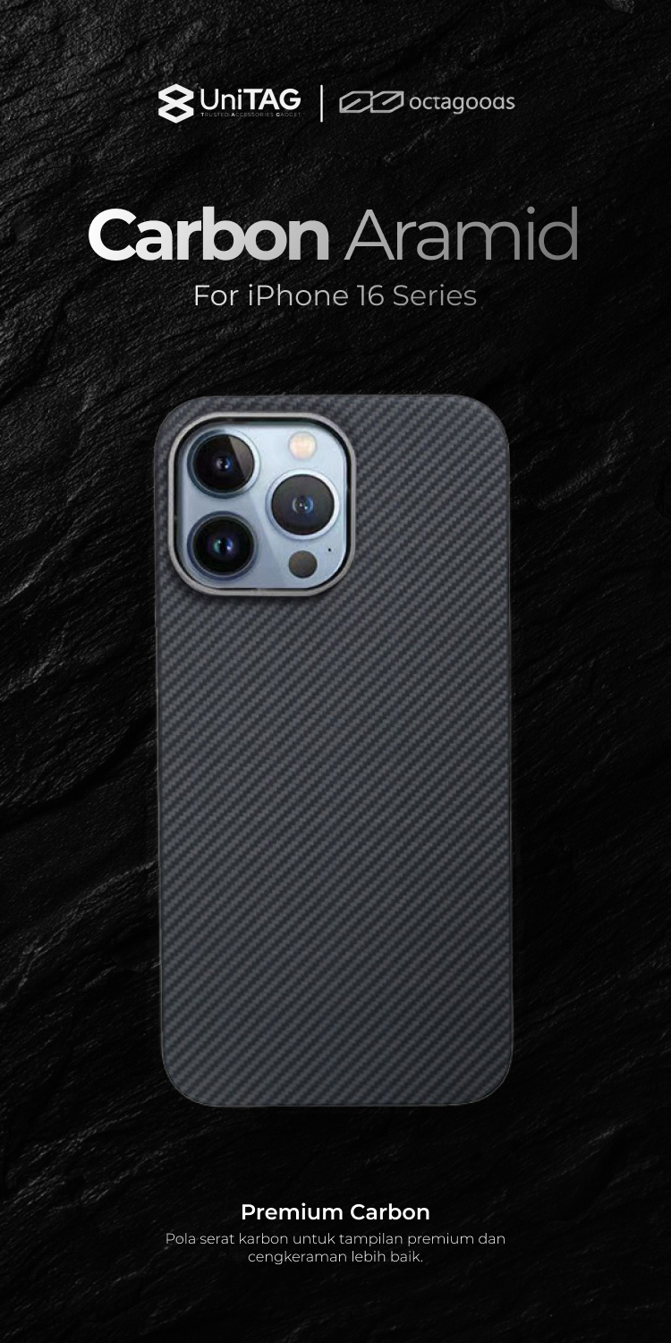 Case iPhone 16 Pro Max Plus octagoods Carbon Aramid Magsafe Slim Cover Casing merupakan casing yang berbahan premium dengan tekstur karbon yang cocok untuk kamu yang ingin tampil lebih elegan dan stylish.