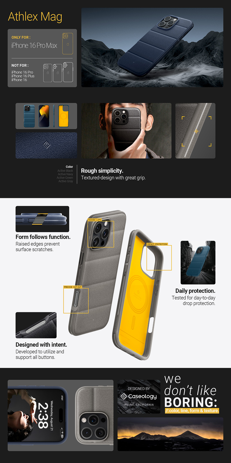 Case iPhone 16 Series Caseology Athlex berbahan Hardcase pada bagian dalam dengan finishing berbahan softcase dengan tekstur pasir pada bagian belakang case yang anti slip ditambah dengan anti shock pada setiap sisi bikin kamu siap beraktivitas, anti was-was !
