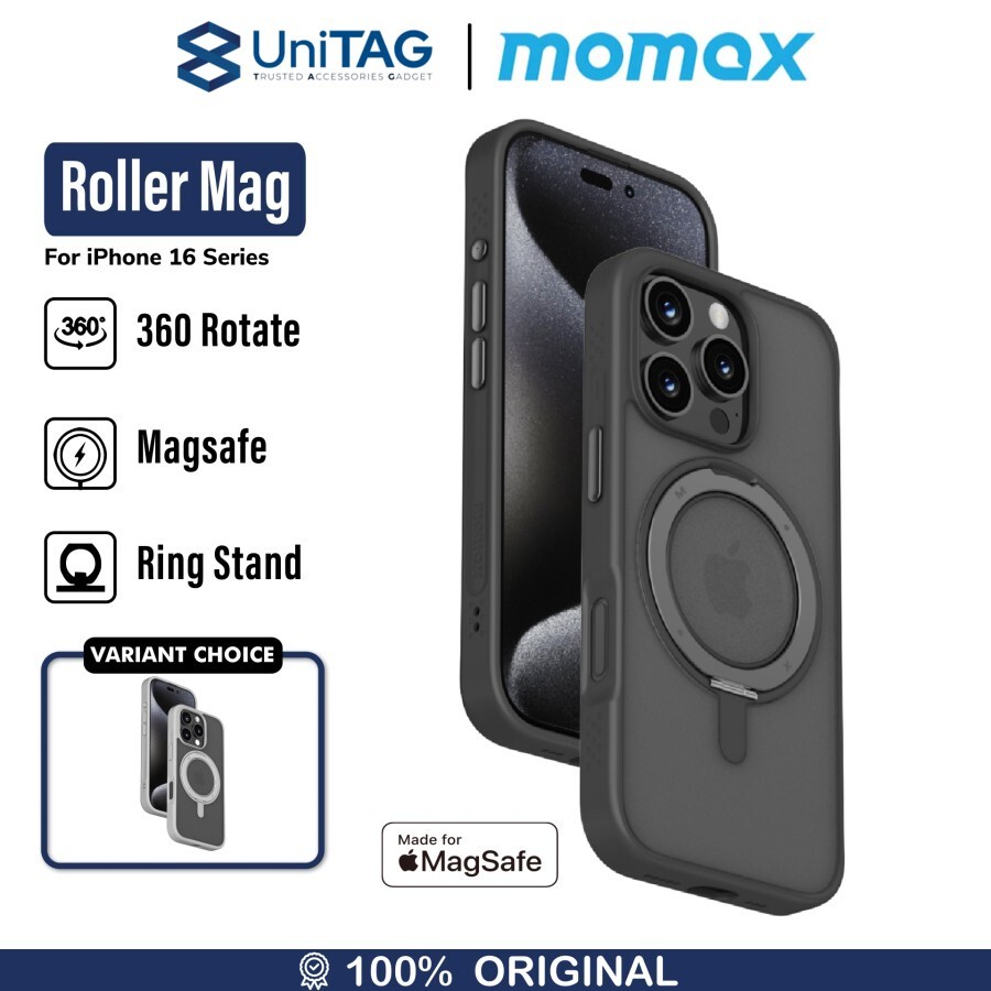 Case iPhone 16 Series Momax Roller MagSafe Hybrid Cover Casing dengan magsafe plate dan ring holder yang dapat diputar 360 derajat bikin kamu entertain anywhere, anytime !
