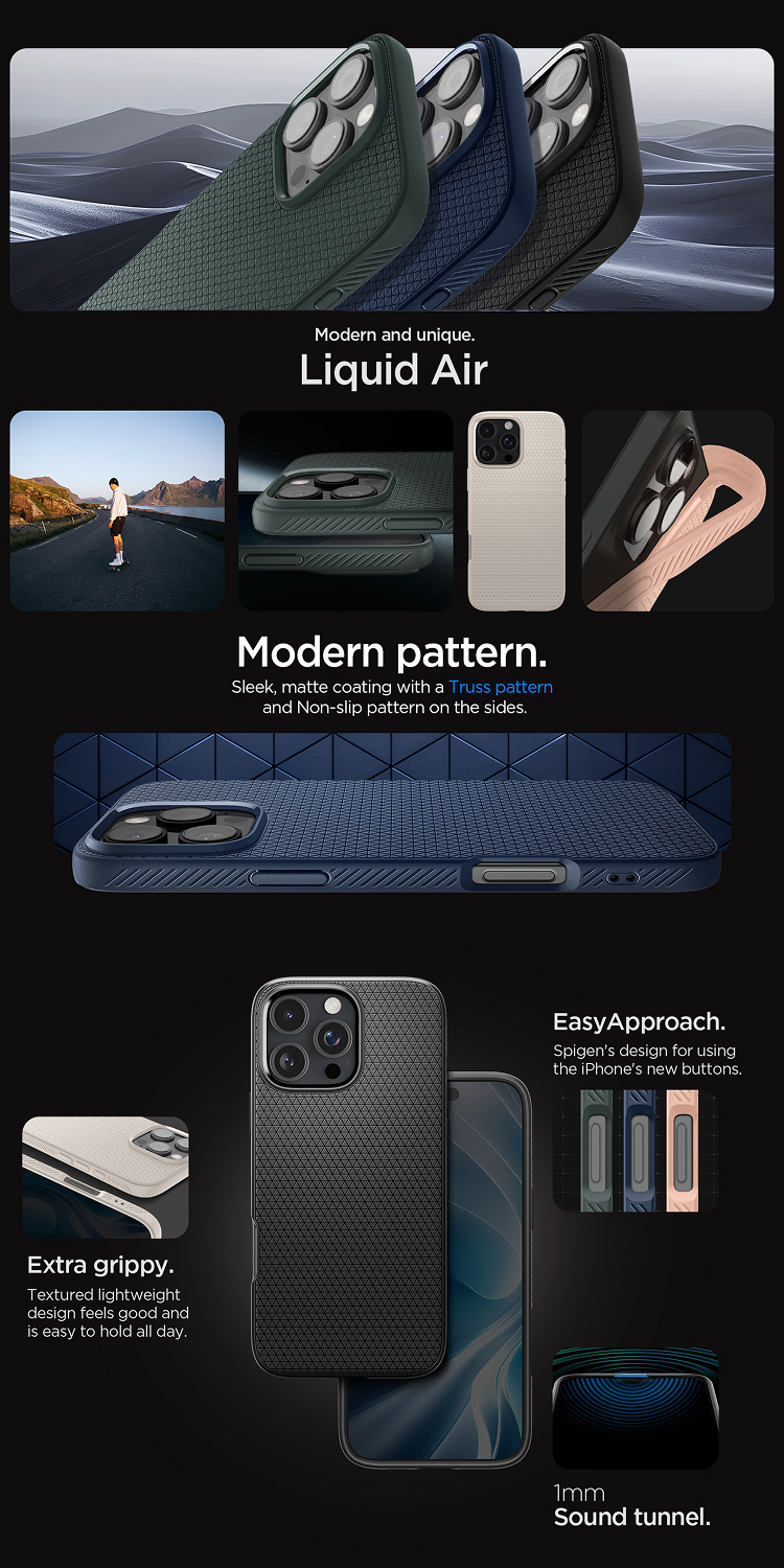 Case iPhone 16 Series Spigen Liquid Air berbahan Soft case premium yang fleksibel dan tahan lama dengan tekstur geometric pada bagian belakang ditambah teknologi spiderweb yang anti panas bikin iphone kamu perfect grip, perfectly secure !