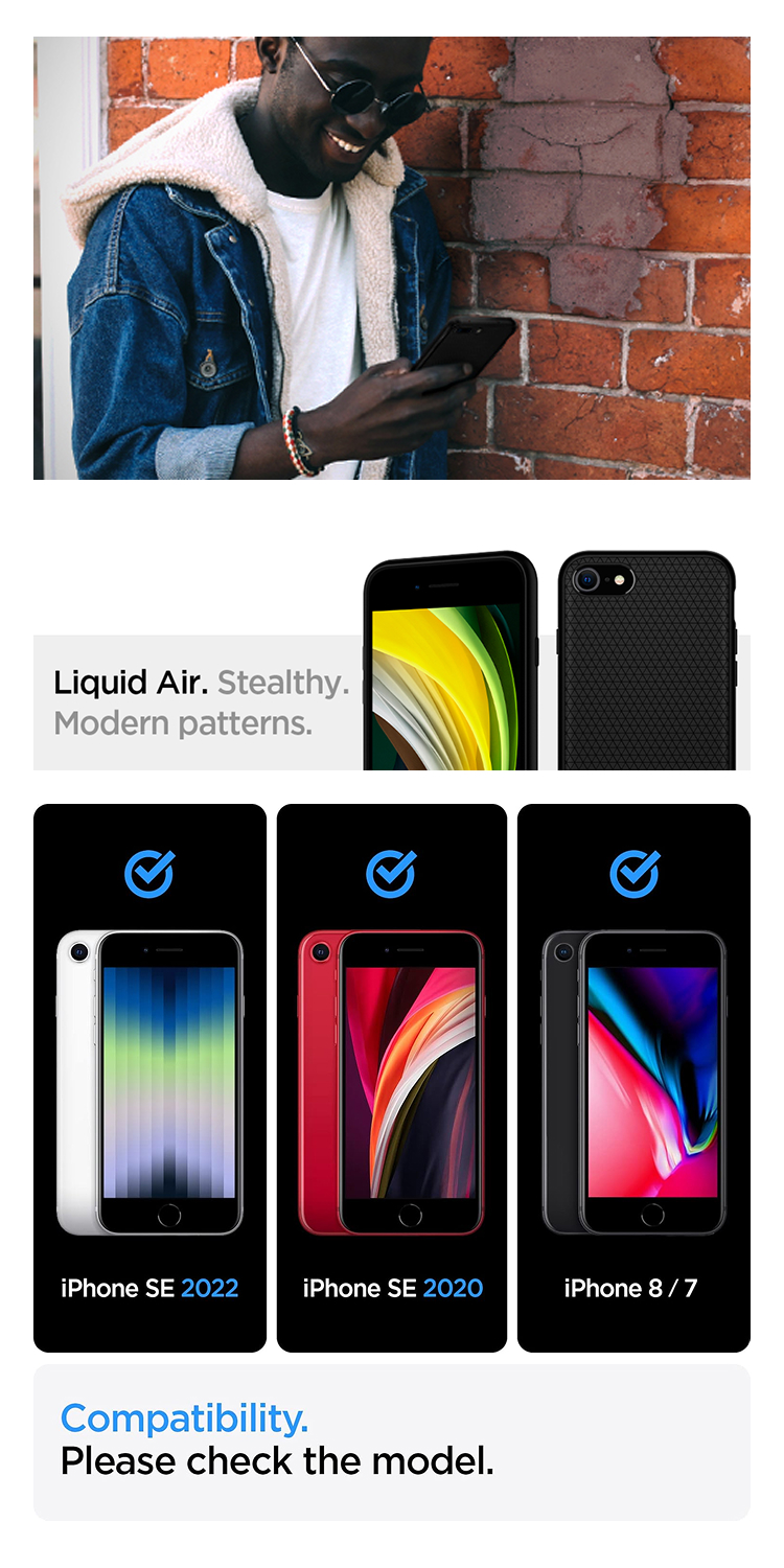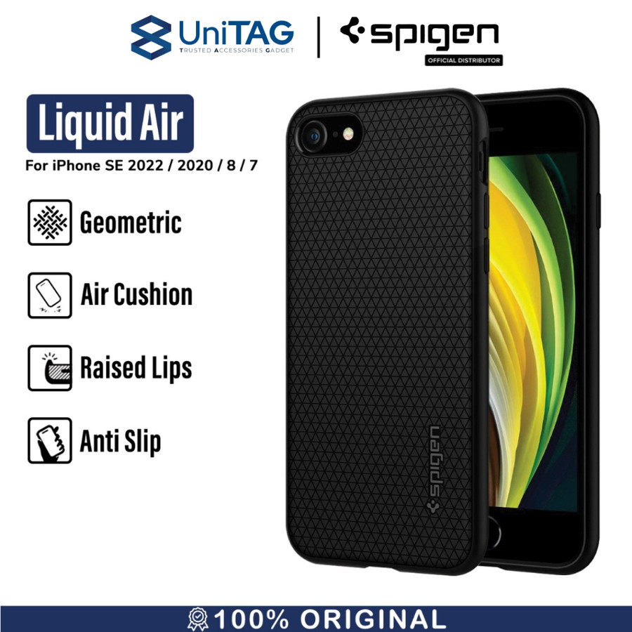 Case iPhone SE 2022 / 2020 iPhone 8 / 7 Spigen Liquid Air merupakan full TPU Casing (Softcase) premium yang fleksibel dan tahan lama. Spigen Liquid Air dibekali dengan Air Cushion Technology dan pola geometric pada bagian belakang yang mewah. Gunakan Spigen liquid air untuk melindungi dan menemani smartphonemu