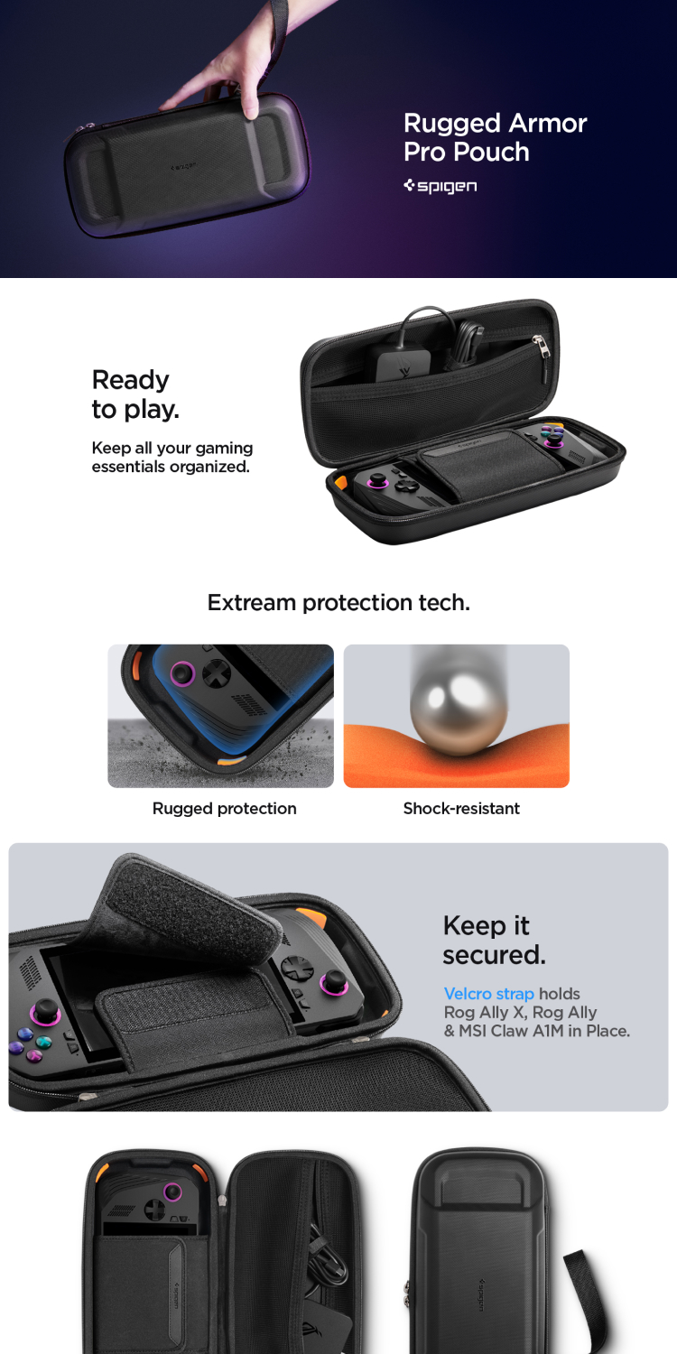 Case Pouch Asus ROG Ally 2023 Spigen Rugged Armor Pro Merupakan Pouch yang terbuat dari campuran bahan PU (Polyurethane) dan bahan EVA (Ethylene Vinyl Acetate) yang akan melindungi Asus ROG Ally 2023 dari benturan external.