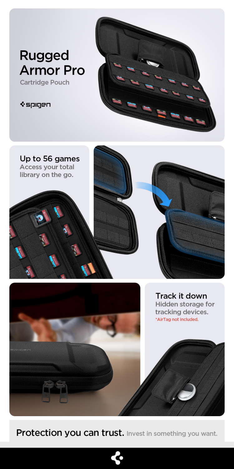 Case Nintendo Switch OLED Spigen Rugged Armor Pro AirTag Pouch Merupakan Pouch yang terbuat dari campuran bahan PU (Polyurethane) dan bahan EVA (Ethylene Vinyl Acetate) yang akan melindungi Nintendo Switch dari benturan external.