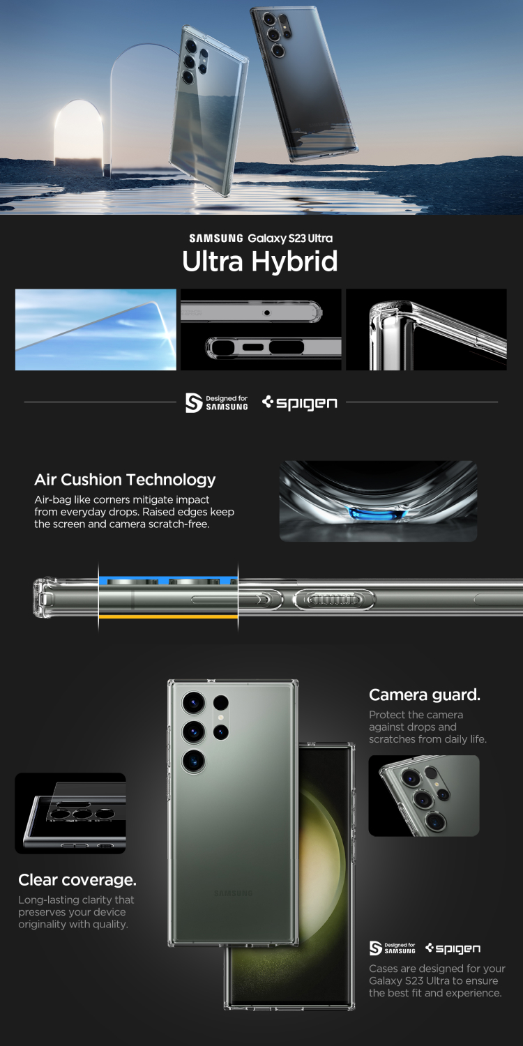 Case Samsung Galaxy S23 Series Spigen Ultra Hybrid merupakan Hybrid case yang terbuat dari campuran bahan Clear PC (Hardcase) dan TPU (Softcase) dengan Air Cushion Technology.