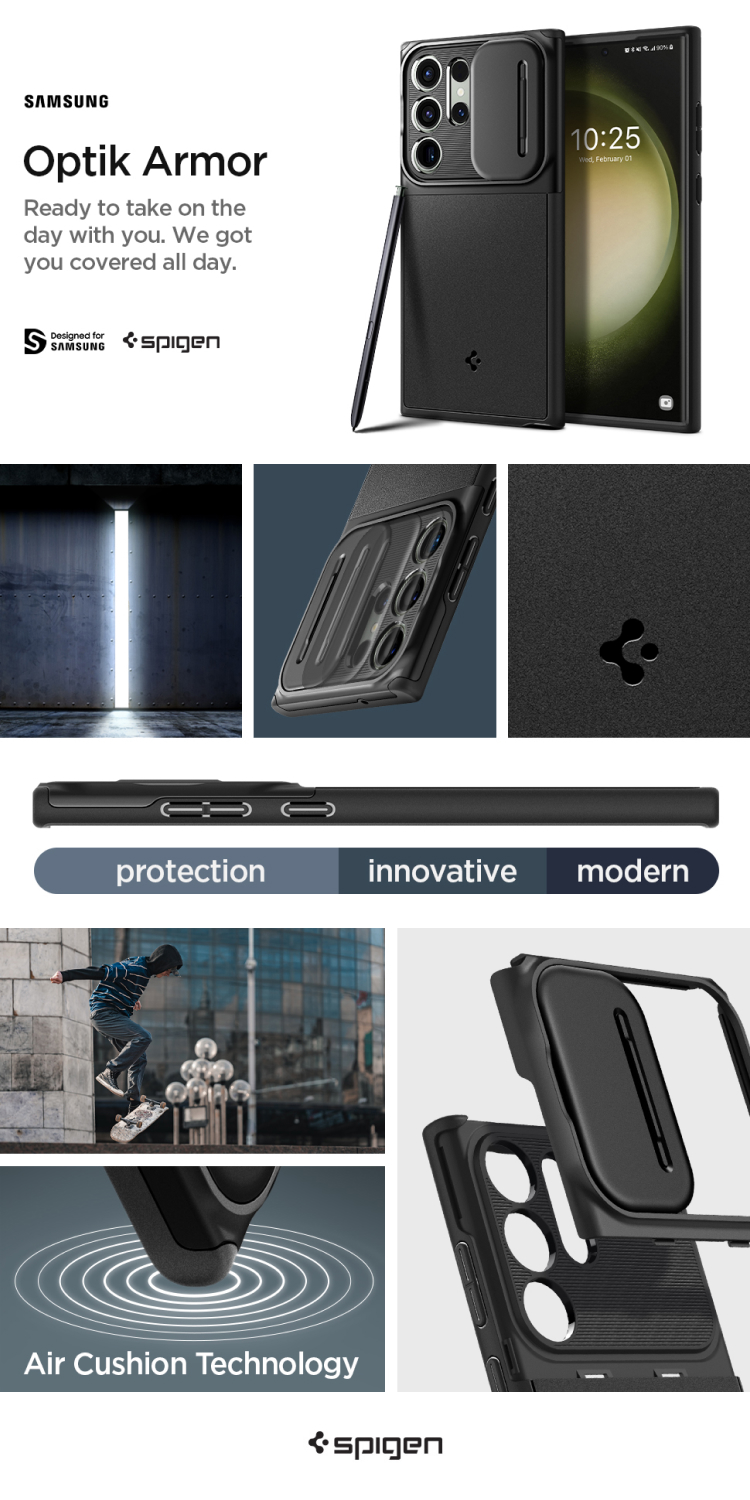 Case Samsung Galaxy S24 Series Spigen Optik Armor Merupakan Hybrid case yang memiliki kamera protector. Casing ini terbuat dari campuran bahan TPU (Softcase) pada bagian body dan bahan PC (Hardcase) pada bagian sliding frame camera.