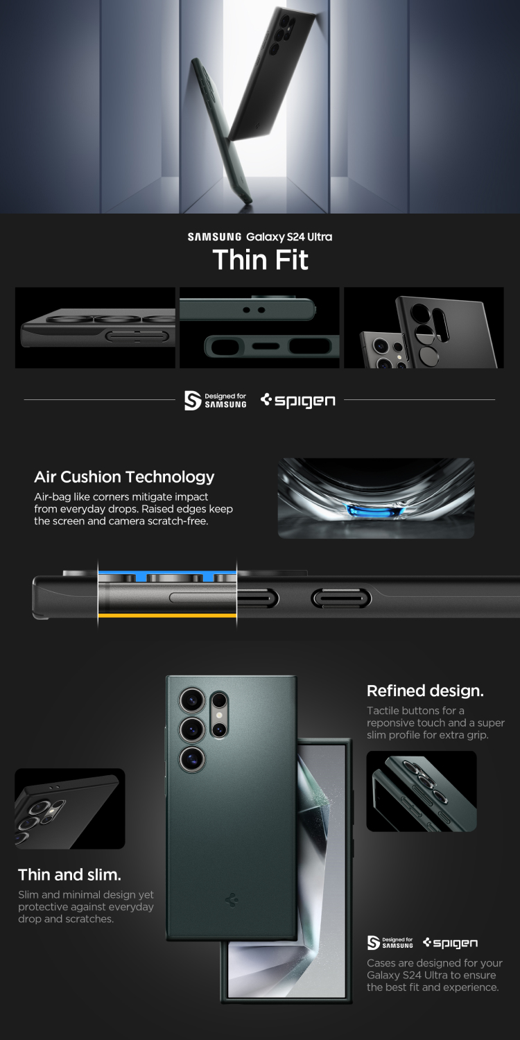 Pelindung HP for Samsung Galaxy S24 Series Spigen Thin Fit Merupakan Slim Hybrid casing yang terbuat dari campuran bahan TPU (Softcase) pada bagian tepi serta bahan PC (Hardcase) premium Matte.