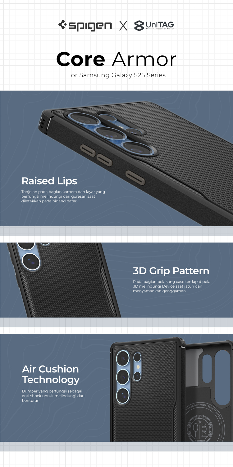 Case Samsung Galaxy S25 Series Spigen Core Armor Merupakan flexible casing fleksibel dari bahan full TPU ini dilengkapi Air Cushion Technology dan tekstur 3D Grip Pattern untuk perlindungan ekstra dan genggaman mantap, pas banget buat kamu yang sering beraktivitas di luar ruangan. Tetap aman dan stylish di mana saja!