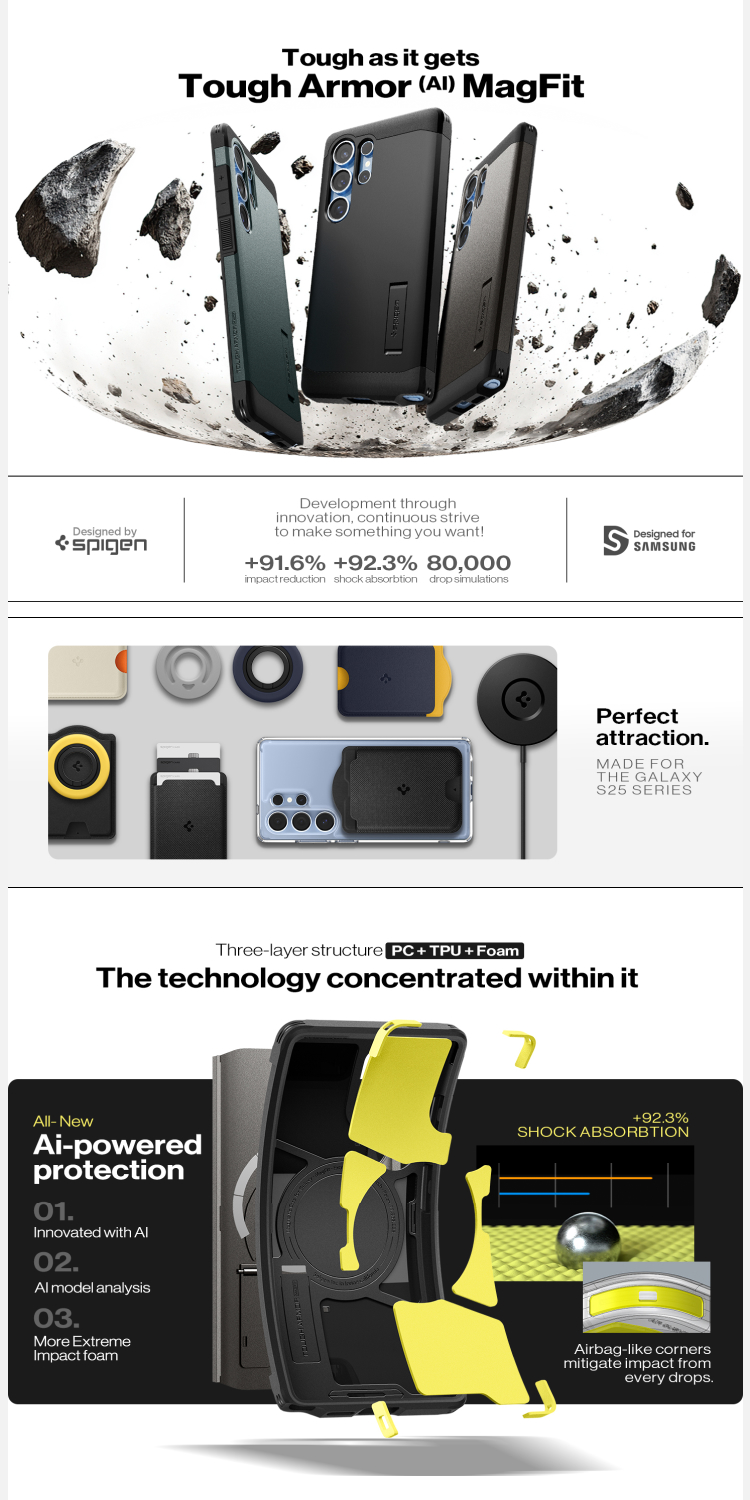 Case Samsung Galaxy S25 Series Spigen Tough Armor / Tough Armor MagFit Casing ini cocok untuk kamu yang aktif di luar ruangan, dengan material Impact Foam yang meredam benturan dan kickstand untuk kenyamanan dan fungsionalitas tambahan untuk Smartphone-mu!!