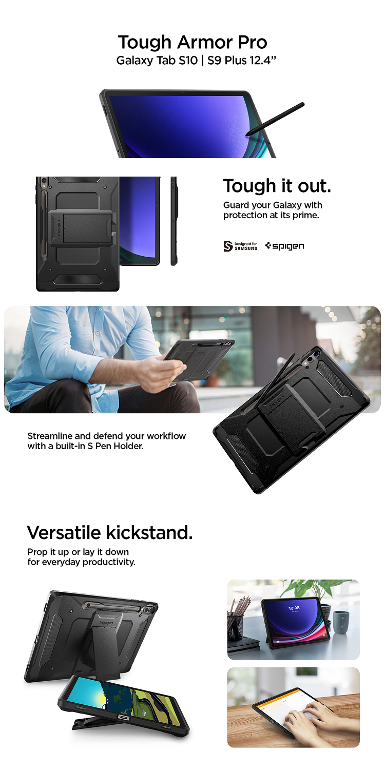 Case Samsung Galaxy Tab S9 Ultra Plus Spigen Tough Armor Pro Stand merupakan casing yang terbuat dari bahan TPU (Softcase) pada bagian dalam dan bahan PC (Hardcase) pada bagian belakang sebagai perlindungan dari benturan.