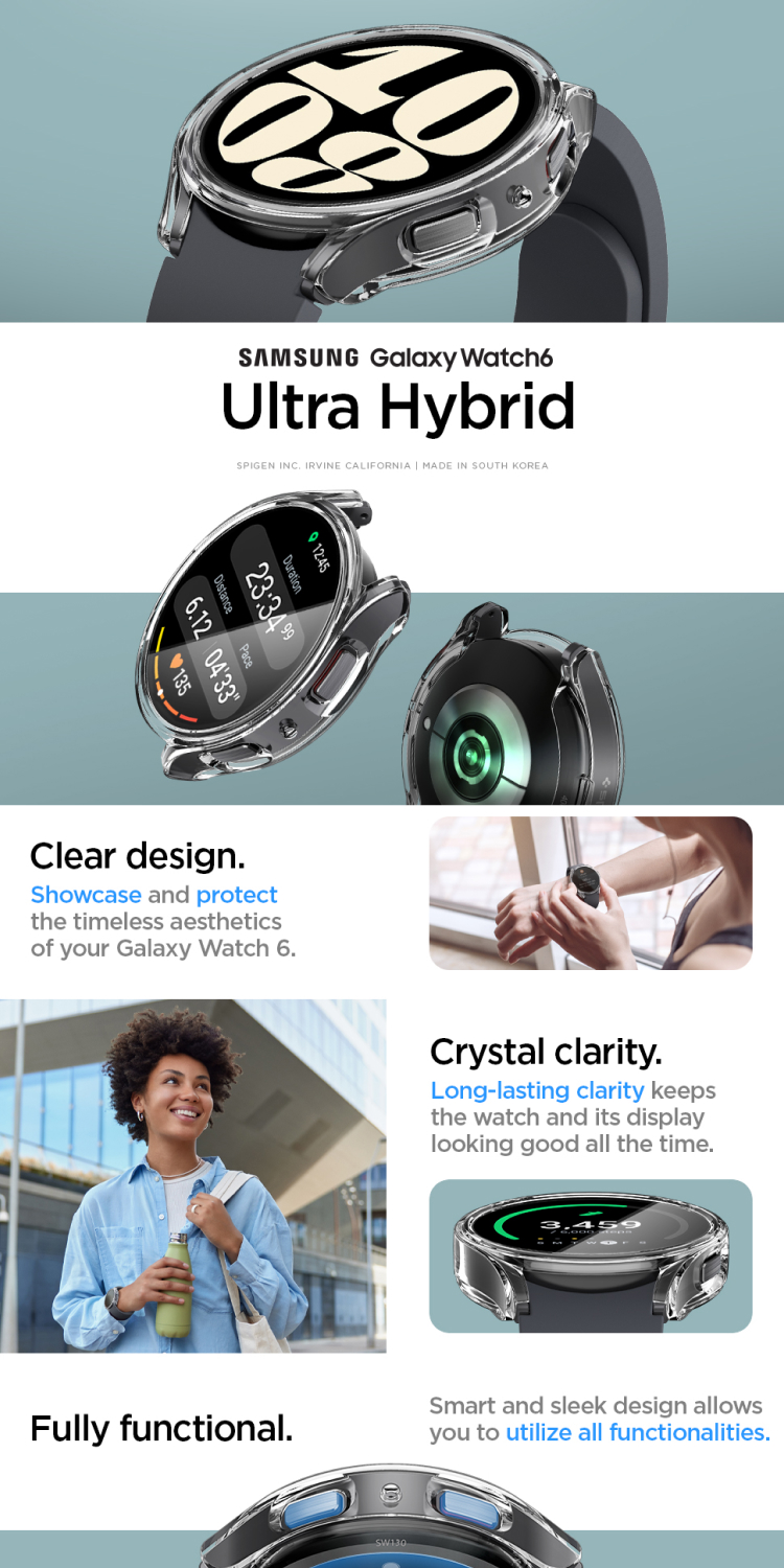 Case Samsung Galaxy Watch 6 44/40mm Spigen Ultra Hybrid Clear Cover Casing merupakan case yang terbuat dari bahan TPU (Softcase) pada bagian bumper untuk menjaga dari benturan sedangkan pada bagian layar terbuat dari bahan clear PC (Hardcase) yang akan melindungi layar Galaxy watch dari goresan.