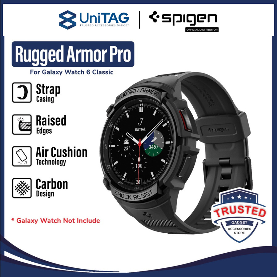 Case Samsung Galaxy Watch 6 Classic 47mm Spigen Rugged Armor Pro Strap merupakan case yang sudah menjadi satu dengan strapnya. Casing ini terbuat dari bahan full TPU (Softcase) yang fleksibel dan mampu menyerap benturan.