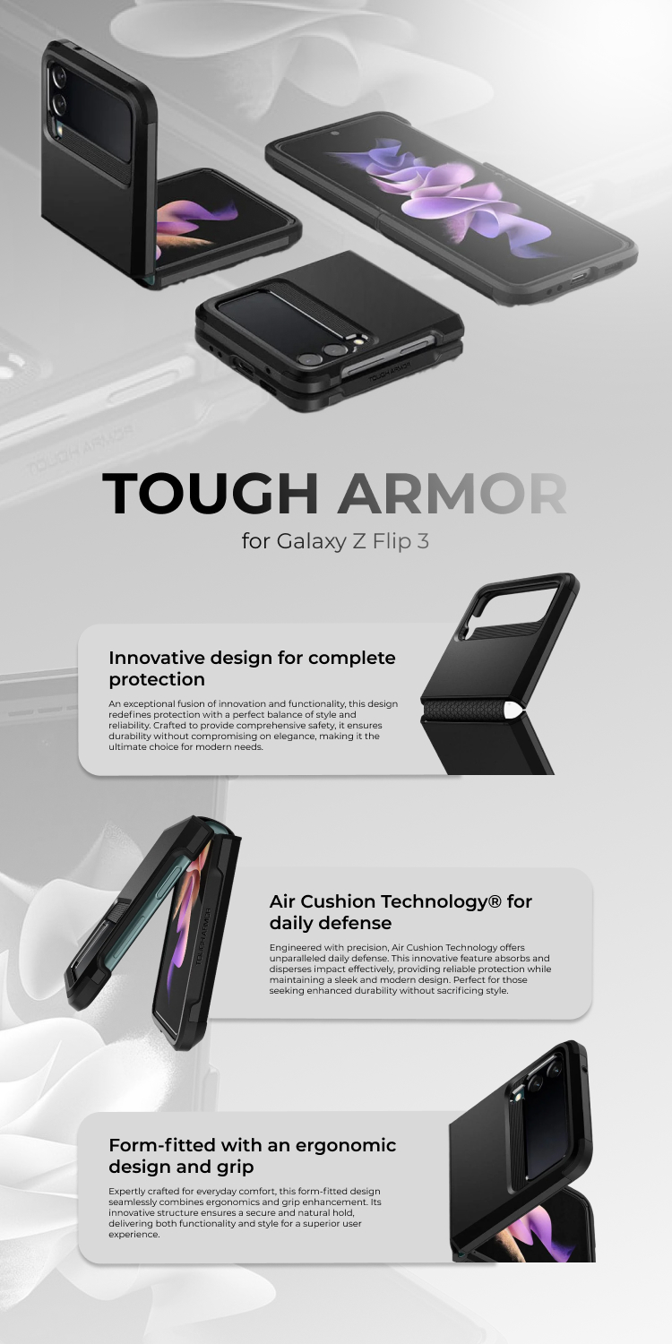 Case Samsung Galaxy Z Flip 3 Spigen Tough Armor Casing merupakan Hybrid case yang memiliki 2 layer dengan kombinasi bahan TPU (Softcase) pada bagian dalam dan PC (hardcase) pada bagian luar.