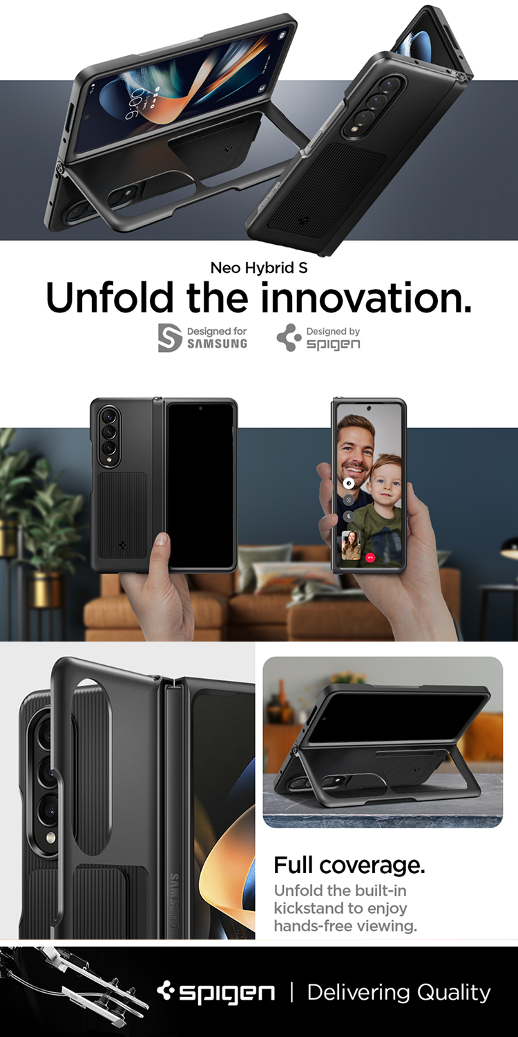 Case Samsung Galaxy Z Fold 4 Spigen Neo Hybrid S merupakan stand casing yang terbuat dari campuran bahan TPU (Softcase) dan PC (Hardcase) premium sehingga dapat meredam benturan.