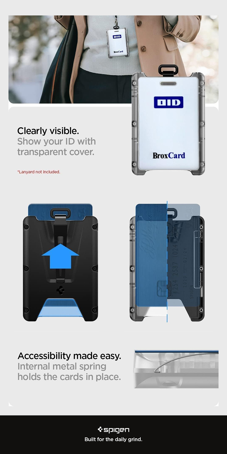 Card Holder Spigen Universal Badge Holder Card Wallet terbuat dari bahan PC (Hardcase) yang transparan sehingga agar ID Card dapat terlihat. Card Wallet dapat menampung hingga 4 kartu serta memiliki lapisan yang melindungi dari RFID Scanning yang tidak diinginkan.