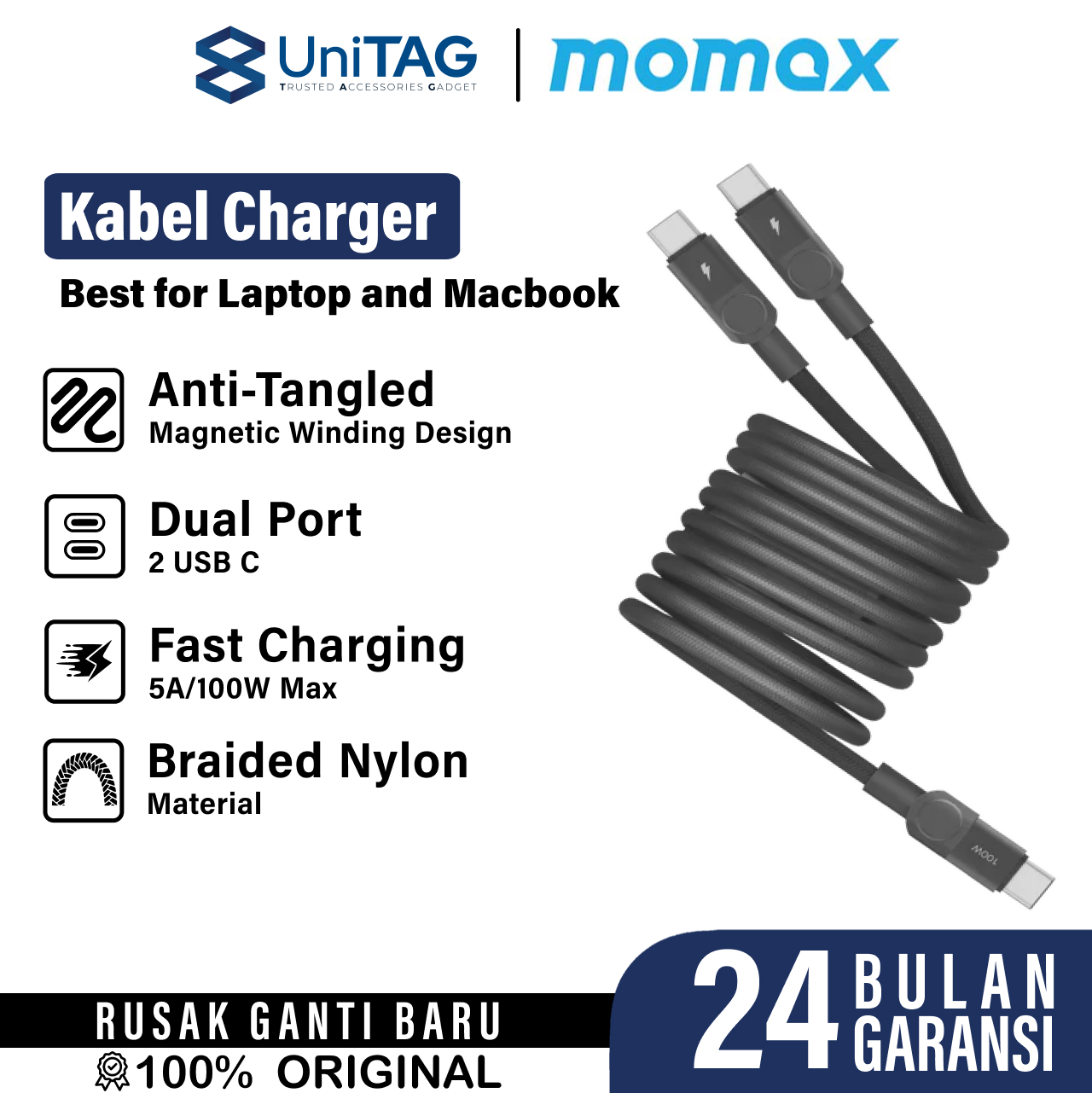 Kabel Data Type C to Type C MOMAX Magnetic Cable Fast Charging PD 100 Watt 5A