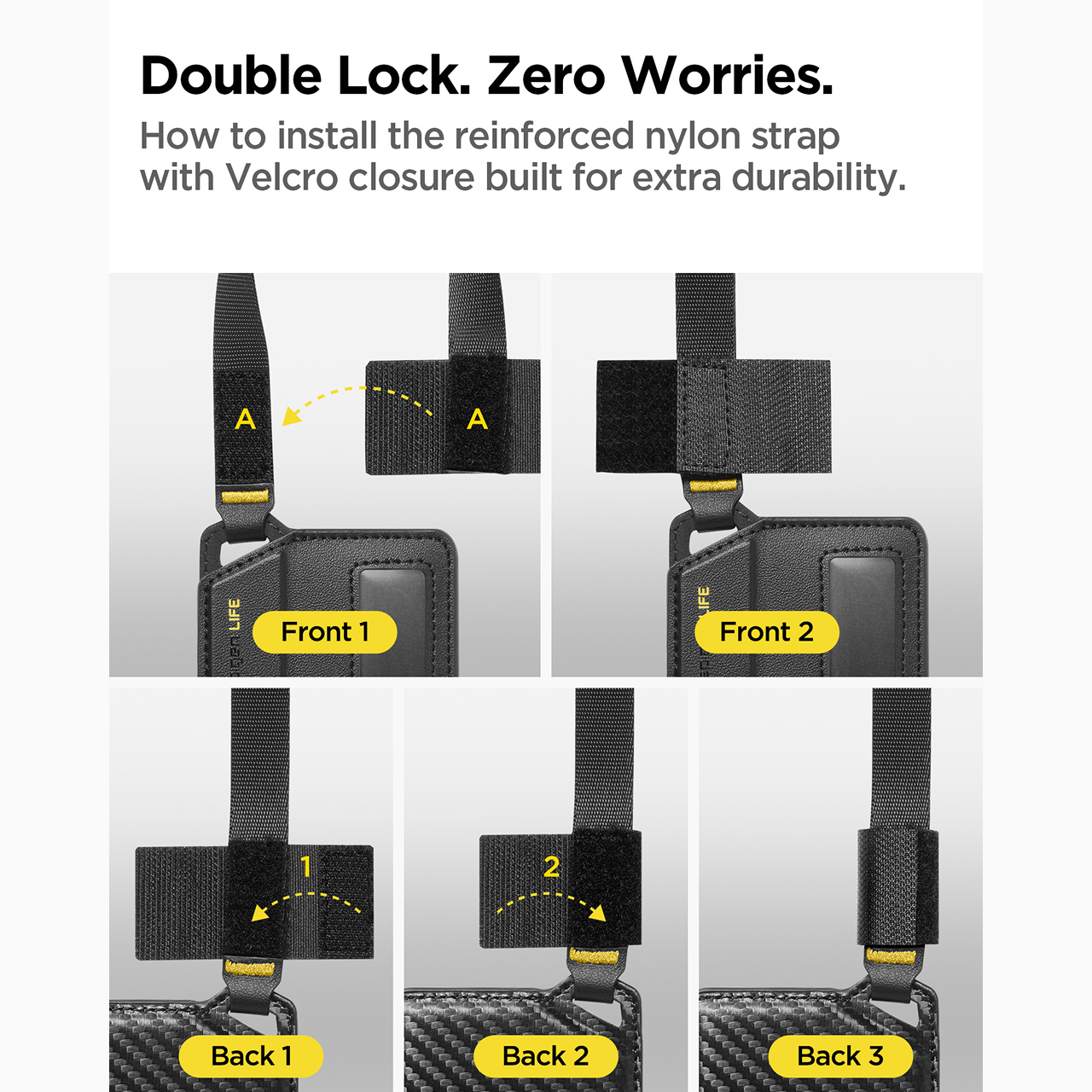 Strap nilon dengan kunci ganda Velcro, ekstra kuat dan aman.