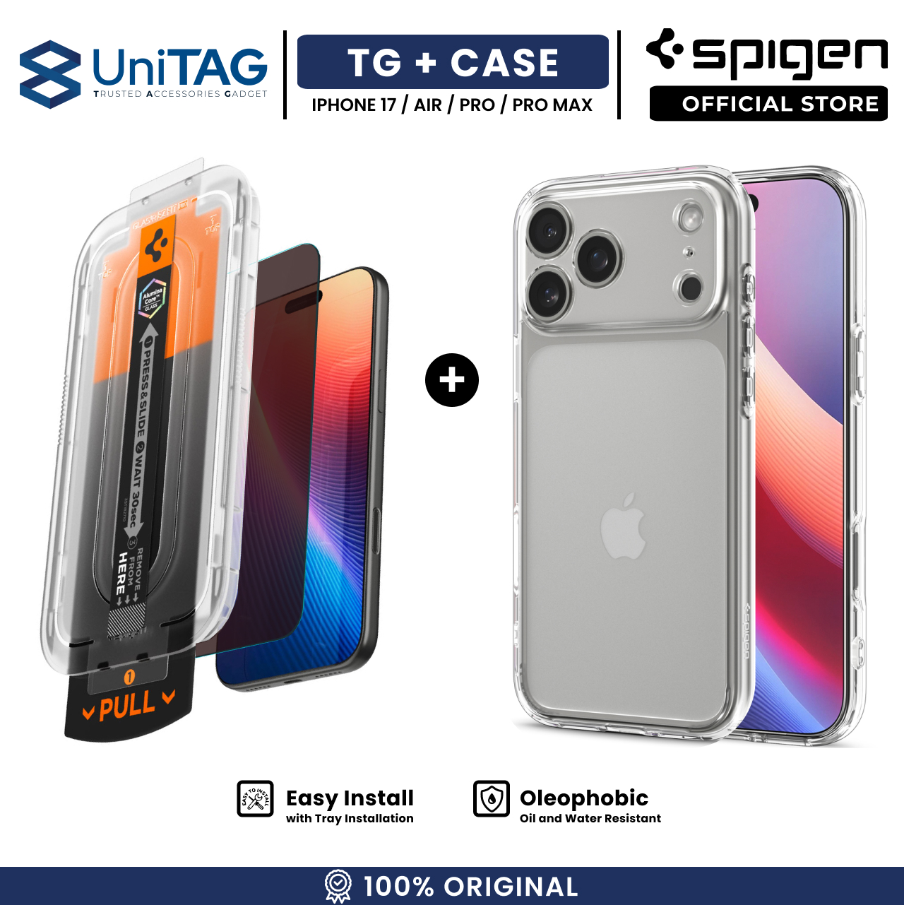 [Pro Bundle] Spigen for iPhone 17 Air Pro Max Tempered Glass with Tray GlastR EZ Fit Pro HD Privacy Anti Spy + Pelindung HP Spigen Ultra Hybrid Crystal Clear Case Anti Yellowing