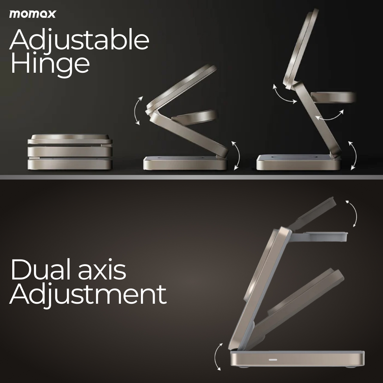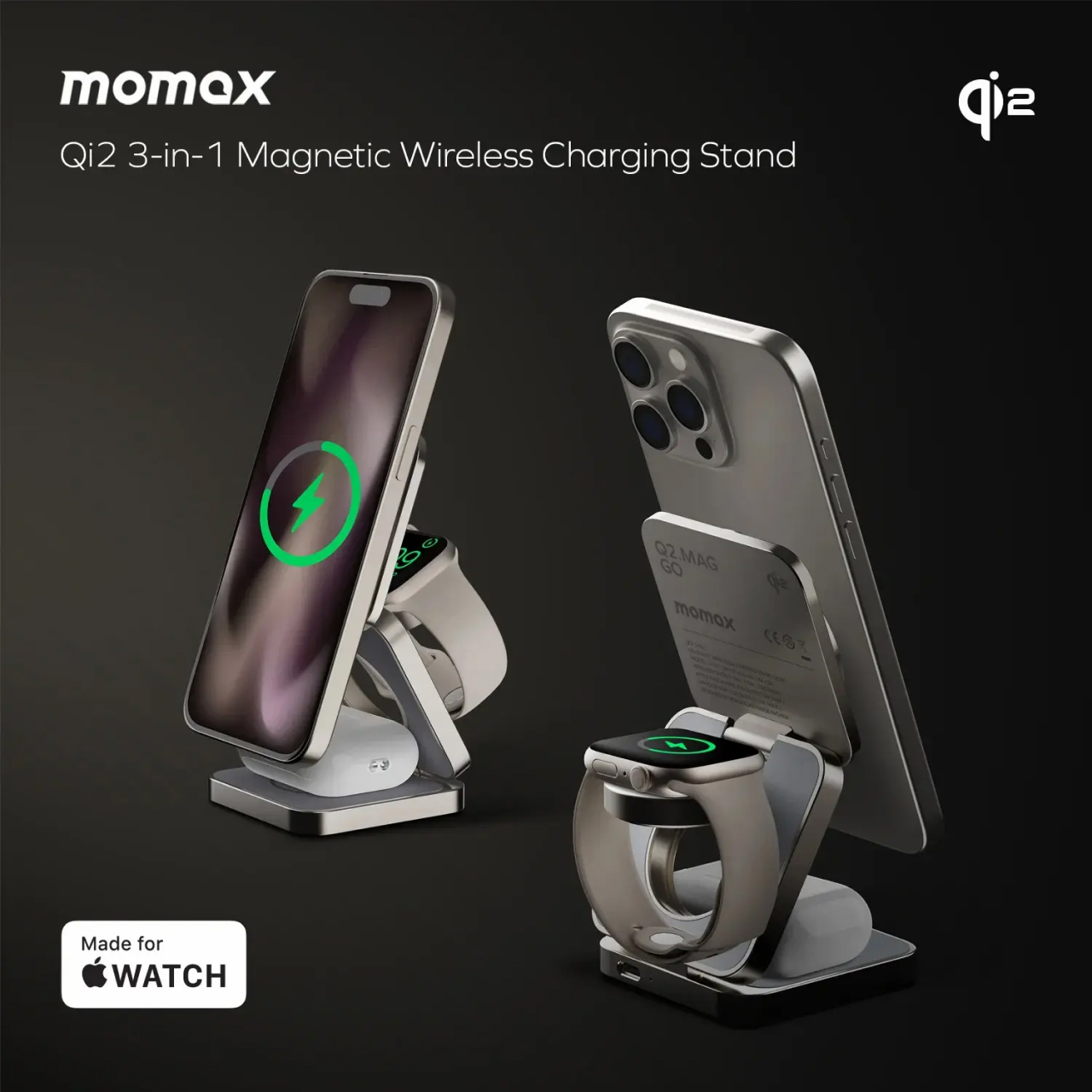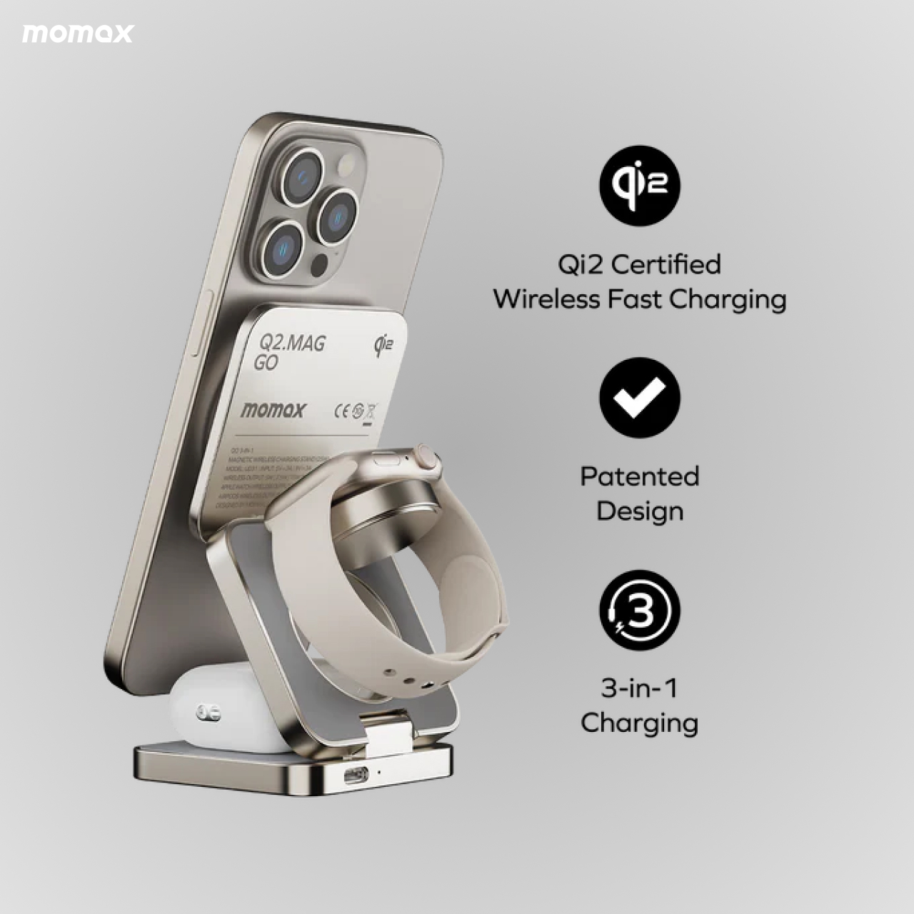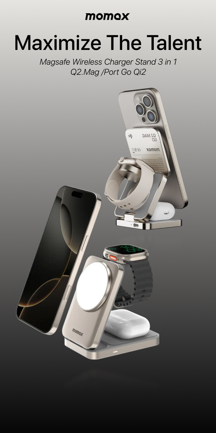 Stand Holder Magsafe Momax Q.Mag Go Trio Magnetic 15W Wireless Charging UD31 merupakan magsafe charging berbentuk holder yang bisa dilipat dan mampu mengisi 3 device sekaligus dengan kerekatan maksimal ditambah telah tersertifikasi Qi2 bikin More charge, More ready to have Fun !