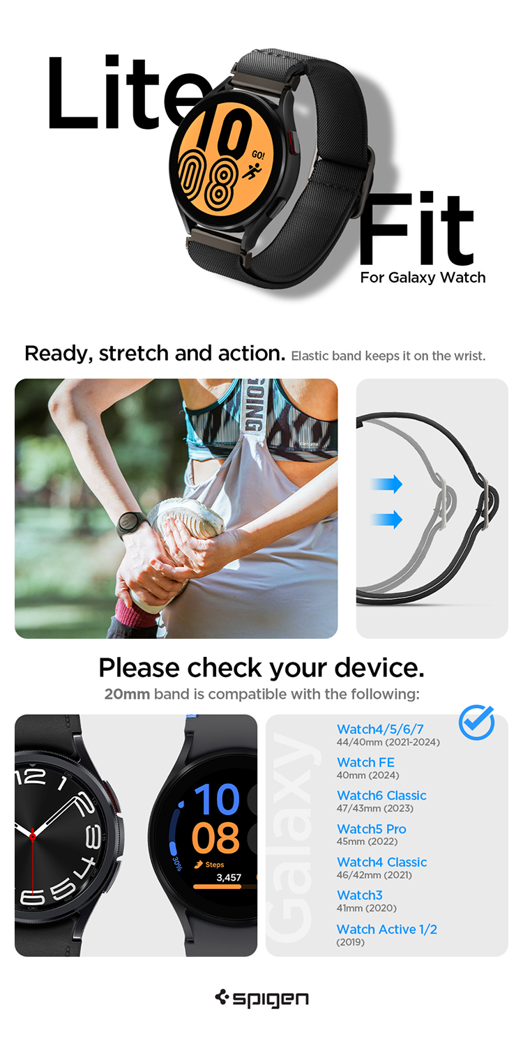 Strap Samsung Galaxy Watch 6 Series / 5 Series / 4 Series / 3 / Watch Active 2 / 1 Spigen Strap Band Lite Fit Terbuat dari bahan Fabric yang nyaman sedangkan bagian bucklenya terbuat dari bahan Zinc Alloy yang tahan goresan serta kokoh dan premium.