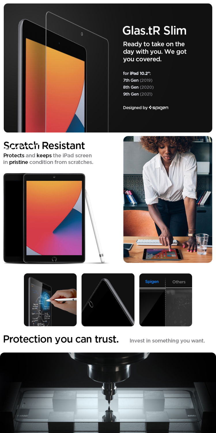 Spigen Glas tR. Slim iPad 10.2″ 8th (2020) / iPad 7th (2019) adalah tempered glass pelindung layar berbahan kaca yang kokoh dengan teknologi 9H Hardness dapat melindungi dari goresan. Dan juga dilengkapi dengan ketahanan Oleophobic