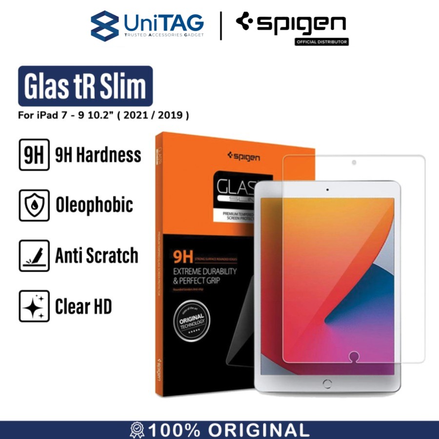 Spigen Glas tR. Slim iPad 10.2″ 8th (2020) / iPad 7th (2019) adalah tempered glass pelindung layar berbahan kaca yang kokoh dengan teknologi 9H Hardness dapat melindungi dari goresan. Dan juga dilengkapi dengan ketahanan Oleophobic