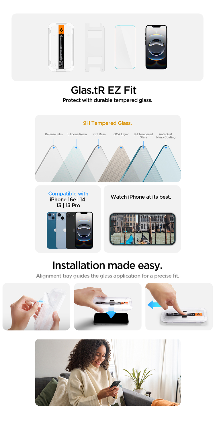 Tempered Glass iPhone 13 Series Spigen Glas tR Ez Fit Menawarkan pemasangan yang mudah karena terdapat alat bantu pasang.