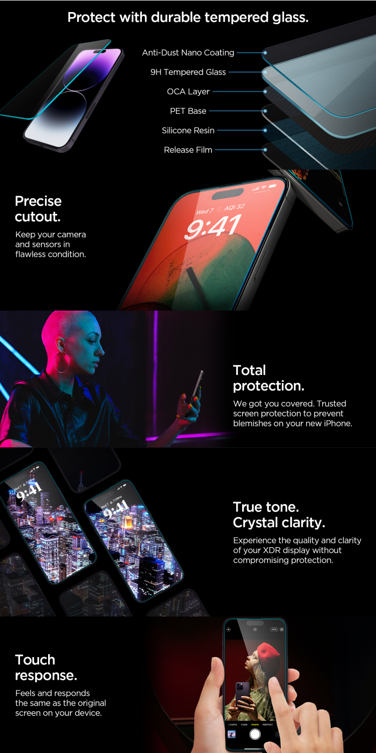 Tempered Glass iPhone 14 Series Spigen Glas.tR Slim Full Cover melindungi layar tanpa mengurangi kualitas serta responsibilitas layar.