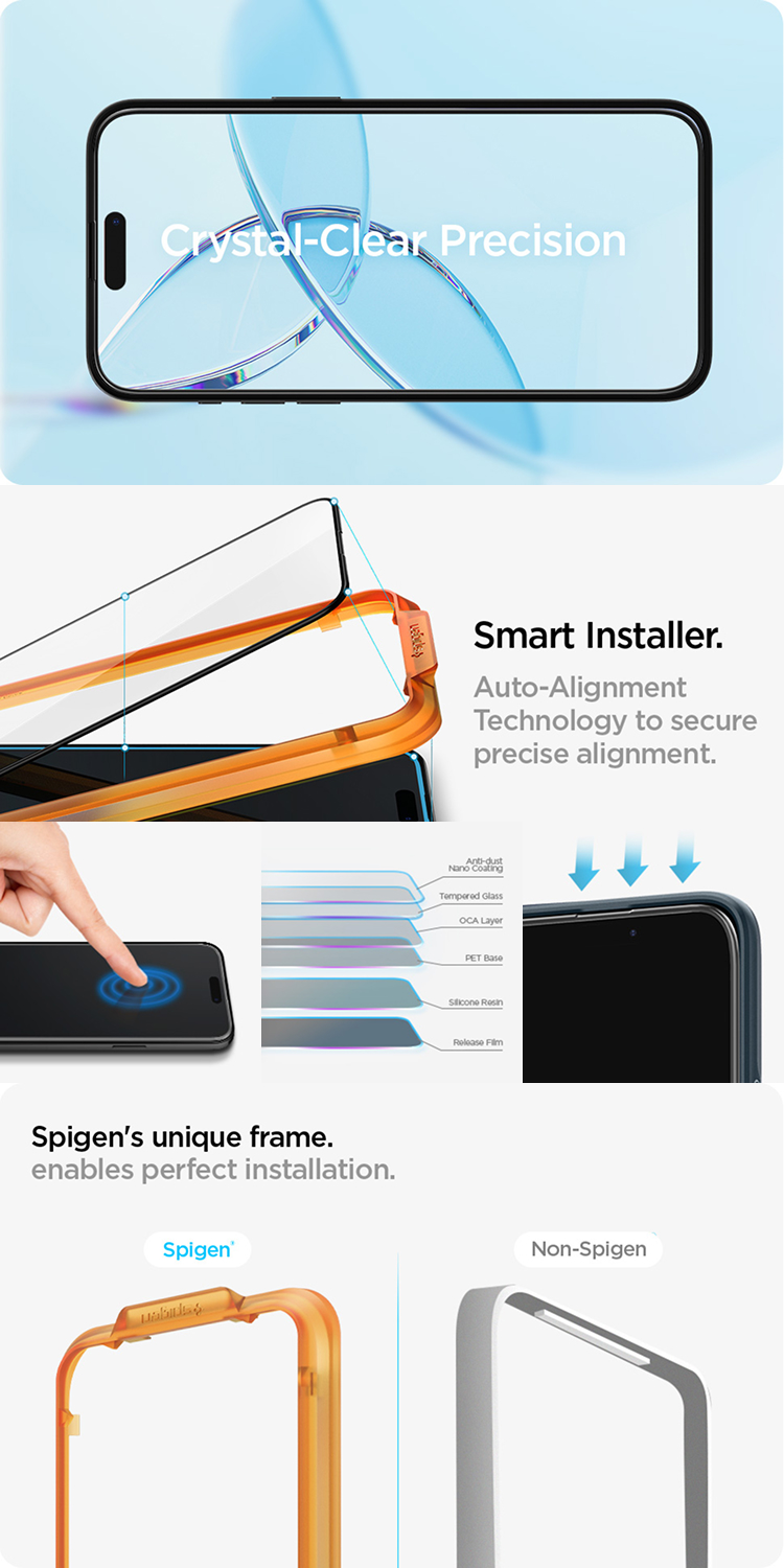 Tempered Glass iPhone 15 Series Spigen Glas tR Alignmaster Menawarkan pemasangan yang mudah karena terdapat alat bantu pasang.