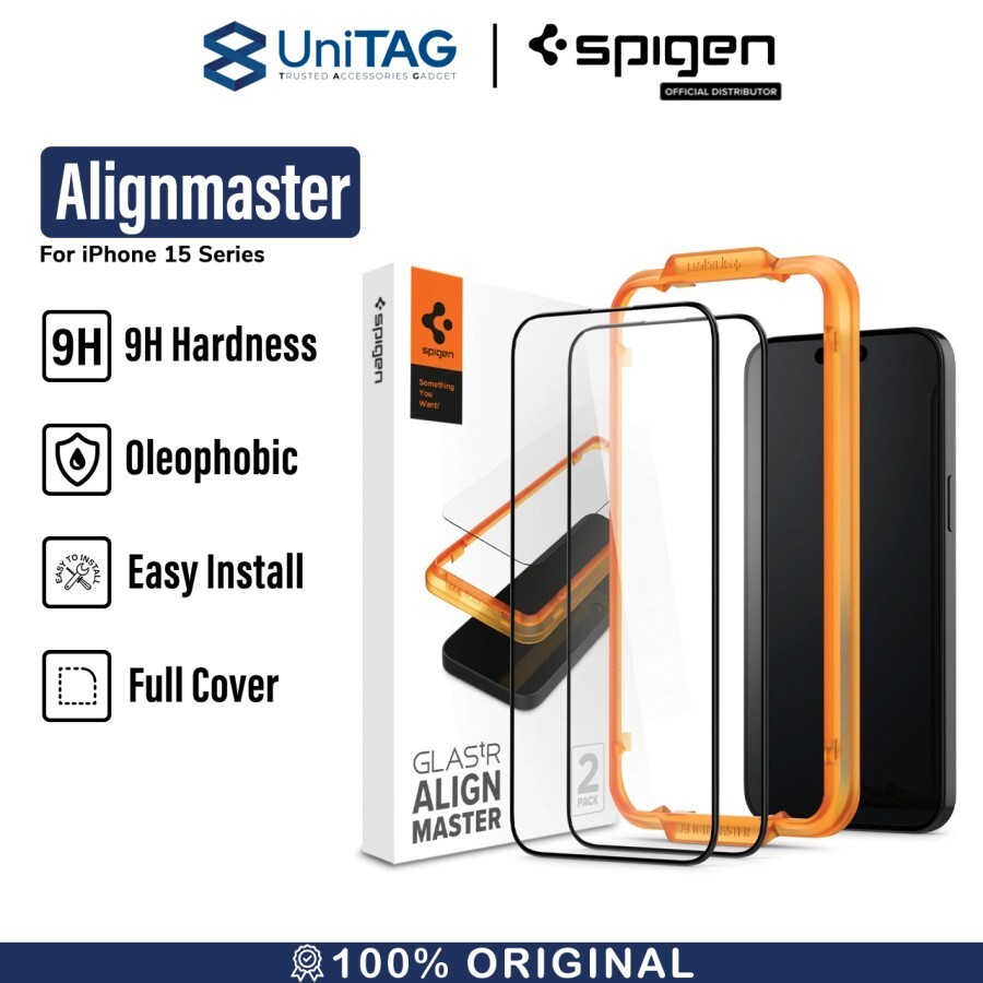 Tempered Glass iPhone 15 Series Spigen Glas tR Alignmaster Menawarkan pemasangan yang mudah karena terdapat alat bantu pasang.