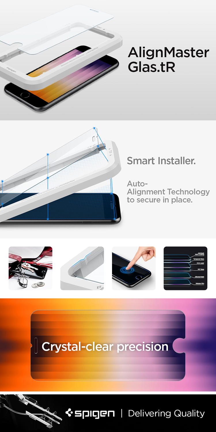 Tempered Glass iPhone SE 2022 / 2020 iPhone 8 / 7 Spigen Glas tR Alignmaster Menawarkan pemasangan yang mudah karena terdapat alat bantu pasang.