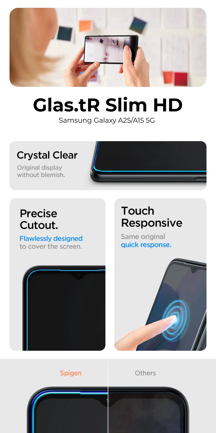 Tempered Glass Samsung Galaxy A25 / A15/ A15 5G Spigen Glas tR Slim terbuat dari premium glass dengan kekerasan 9H Hardness yang memiliki lapisan Oleophobic untuk melindungi dari goresan.