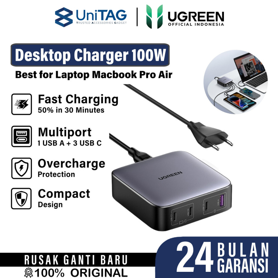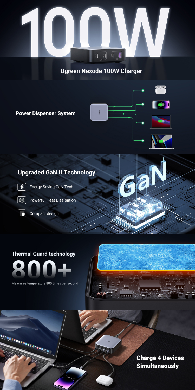 Desktop GaN Charger UGREEN Nexode USB A – USB C 4/6 Port CD327/CD328/CD271 dapat digunakan untuk melakukan pengisian daya cepat beberapa device secara bersamaan.