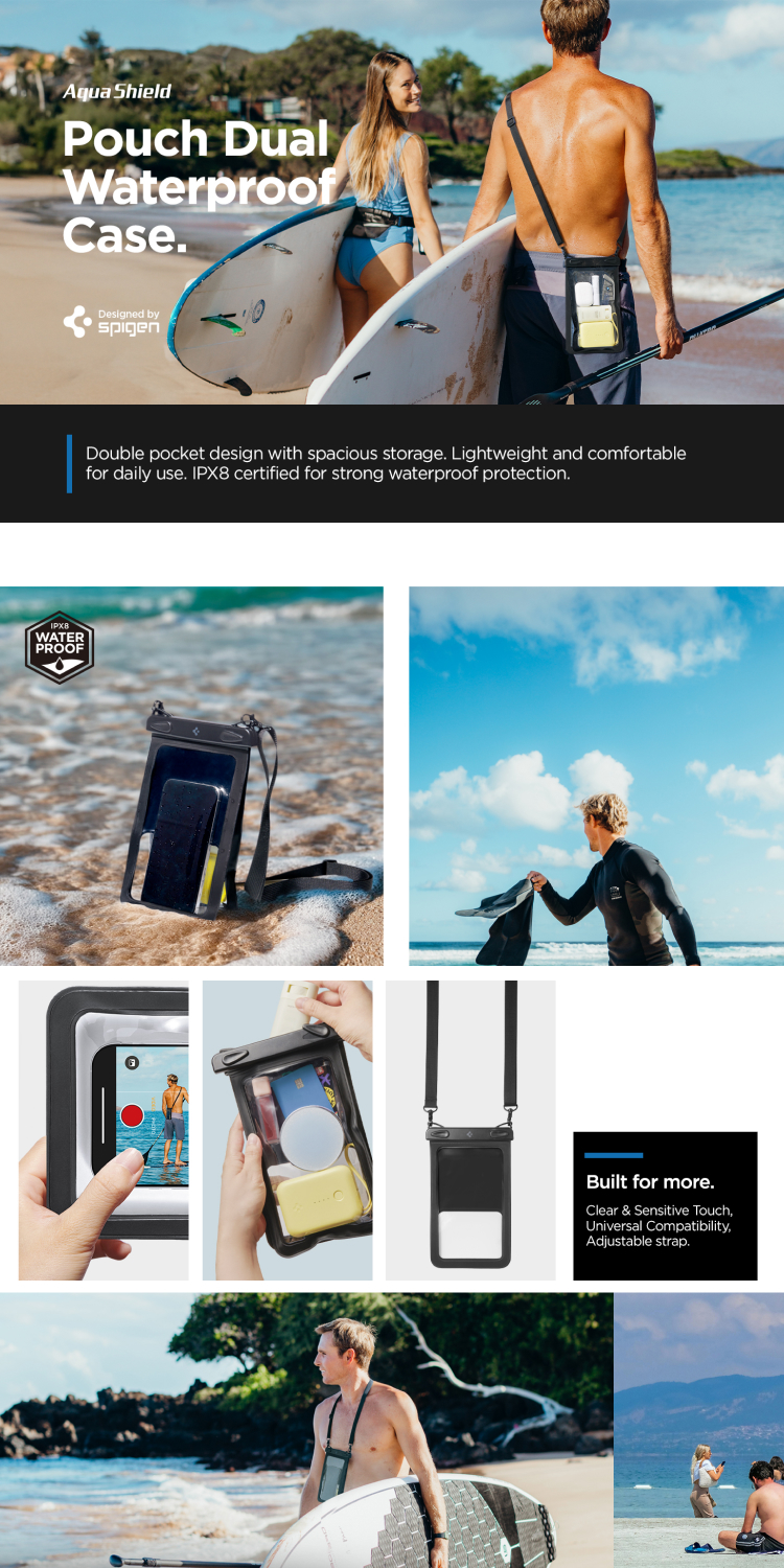 Universal Waterproof Phone Case Spigen Velo A601/A610/A603 dengan secure clasp yang memudahkan untuk memasukkan device maupun barang berharga lainnya namun juga mengunci rapat agar air tidak masuk, waterproof IPX8 yang aman untuk dibuat kegiatan air seperti berenang dan snorkling, bikin barang dan device mu tetap kering dan aman saat main air bersama keluarga !