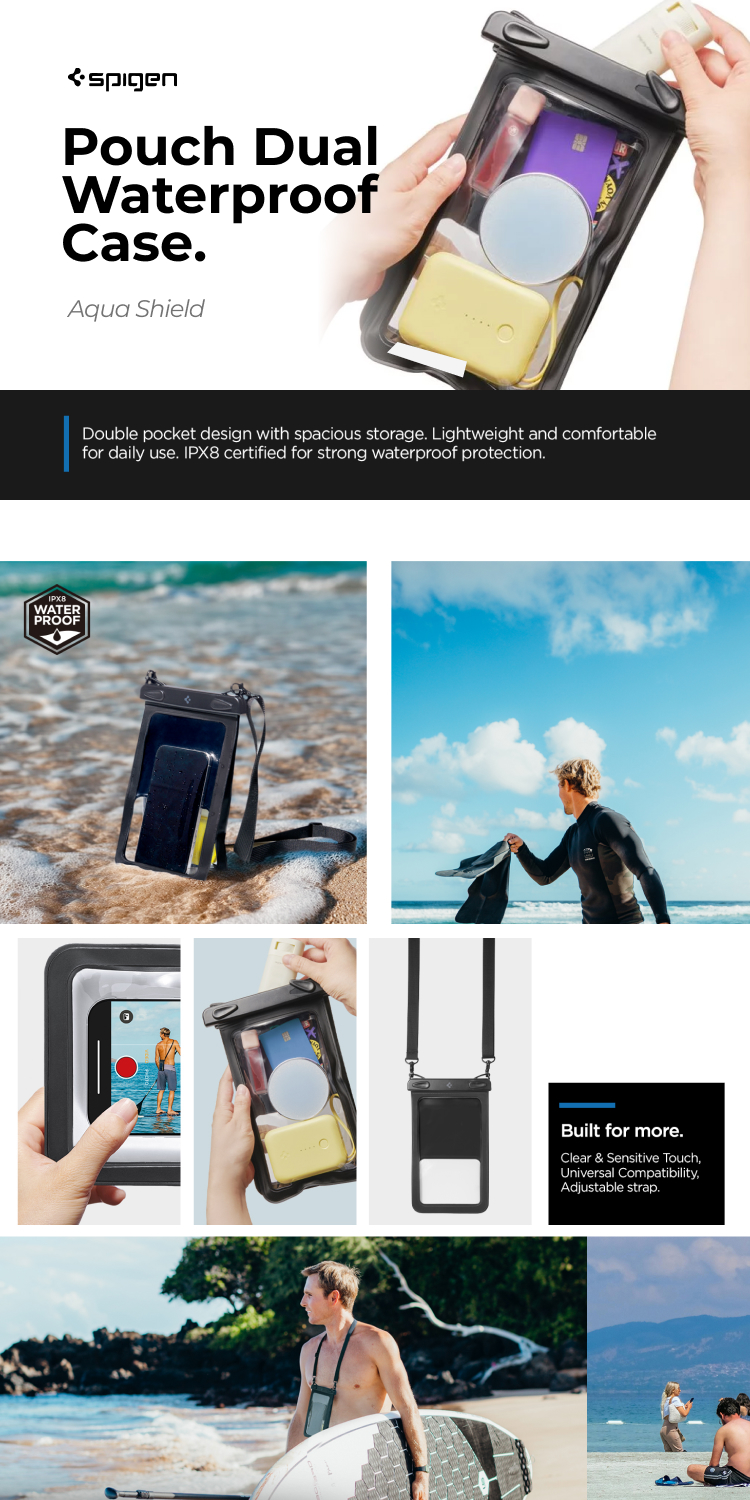 Universal Waterproof Phone Case Spigen Velo A601/A610/A603 dengan secure clasp yang memudahkan untuk memasukkan device maupun barang berharga lainnya namun juga mengunci rapat agar air tidak masuk, waterproof IPX8 yang aman untuk dibuat kegiatan air seperti berenang dan snorkling, bikin barang dan device mu tetap kering dan aman saat main air bersama keluarga !