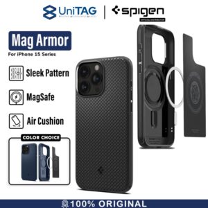 Case iPhone 15 Series Spigen Mag Armor Magfit Merupakan Soft casing yang memiliki magnetic ring pada bagian dalam yang menjadikannya kompatibel dengan MagSafe Accessories. Casing ini terbuat dari bahan TPU (Softcase) premium yang flexible serta dapat menyerap benturan.